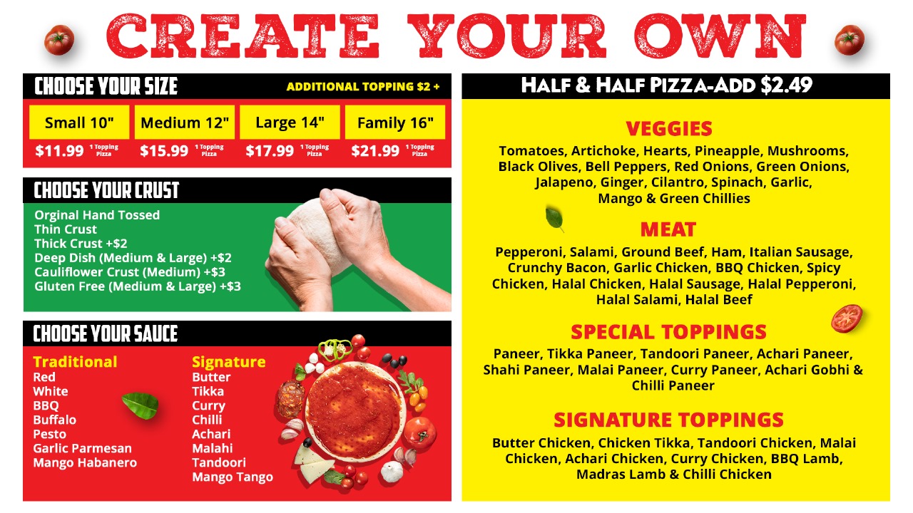 Achari Sauce, Cheese, Garlic, Ginger, Chilies, Mushroom, Red Onion, Black Olives, Achari Chicken & Fresh Cilantro